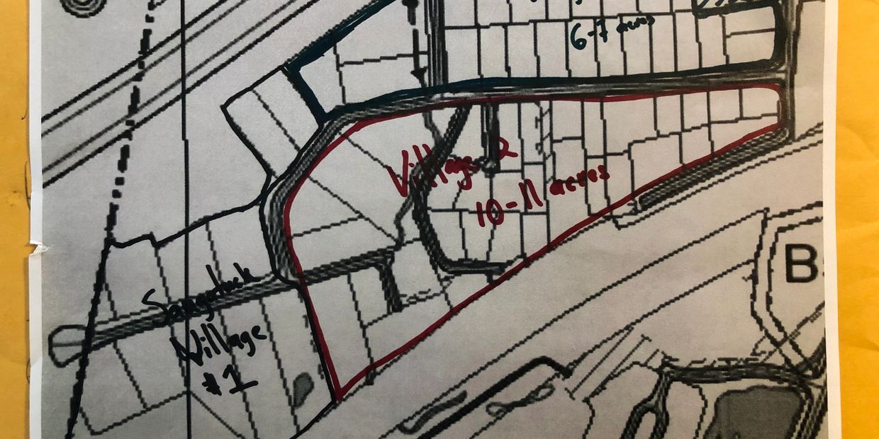 See the rough outline drawn of Charney’s three phases of proposed development to replace and rebuild Old Saugatuck. Note village 1 (Same as yellow in Map A), village 2 (Same as blue in Map A), and village 3 (Same as white in Map A).